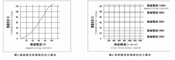 磁粉式離合器(電磁粉末式離合器)激磁電流與轉(zhuǎn)矩的關(guān)系,及滑差轉(zhuǎn)速與轉(zhuǎn)矩的關(guān)系如下圖: