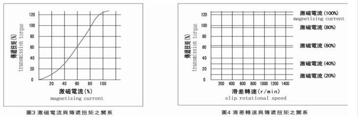 雙伸出軸磁粉離合器傳遞的轉矩與激磁電流基本成線性關系(正比例關系),只要改變激磁電流的大小,便可在較大的范圍內控制扭矩的大小。如果激磁電流保持不變的話,其傳遞的轉矩是不受主動件與從動件之間的轉速差(滑差轉速)的影響,因此,對軸式磁粉離合器的靜摩擦轉矩與動摩擦轉矩基本是沒什么差異的,說明容易進行扭矩控制,如下圖: