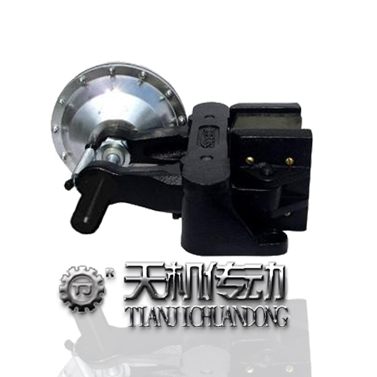 東莞天機傳動生產銷售的DBM-10油壓碟式制動器,DBM-20油壓碟式制動器統稱油壓碟式制動器,是裝設于車輛剎車系統上,其包括有對應剎 車盤片的滑座、定位在車輛上的本體,該滑座則配合復位彈簧滑設在本體上。且本體配合滑座設有一控制閥組,該本體對應該控制閥組設有一個連接車輛油壓系統的 油壓槽,而油壓槽則以迫掣組件迫掣剎車盤片;藉油壓增壓將本體的迫掣組件推動 剎車來令片夾掣剎車盤片進行剎車動作,藉剎車慣性作用力大于復位彈簧的彈力時 會讓滑座在本體上位移,而滑座的位移量到達默認值(設計為慣性力較大值)時會運 用控制閥組關閉車輛油壓系統的通路,再將油壓槽油壓釋壓,讓剎車壓力在瞬間降 低,并利用一復位彈簧的彈力再讓滑座復位,藉此讓滑座產生往復弧線運作,致使 本發明的碟式剎車器過度掣緊于該剎車盤片。