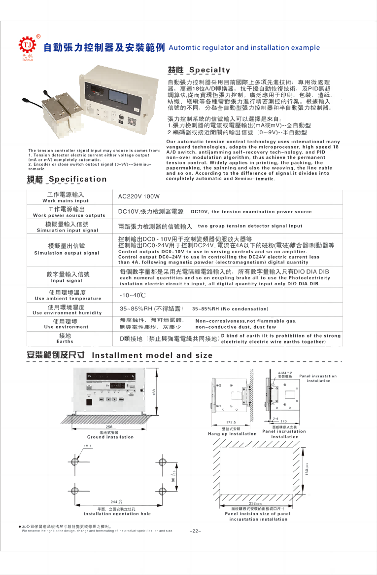 關于接線請參考東莞天機傳動生產的磁粉手動張力控制器,收卷放卷手動張力控制器接線方法,其安裝范例及尺寸如下: